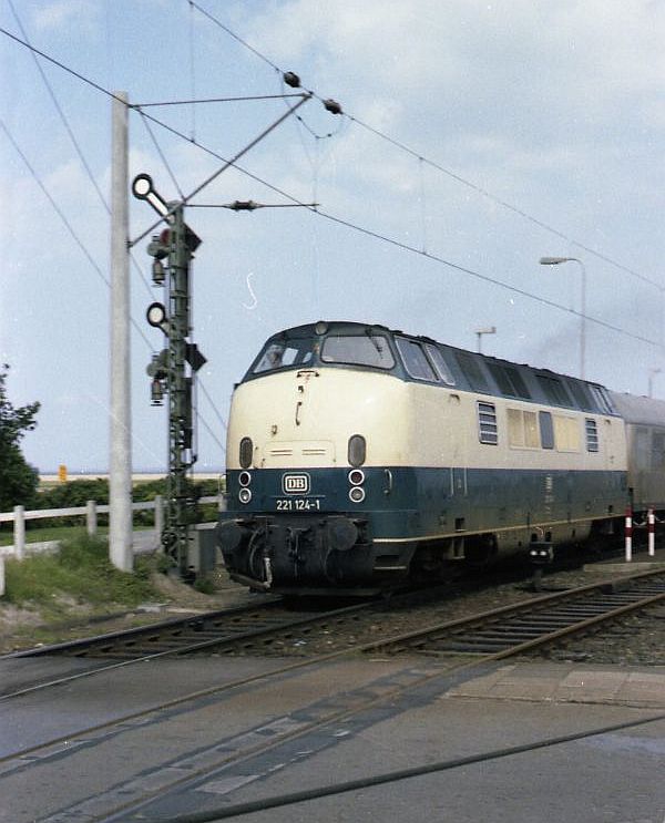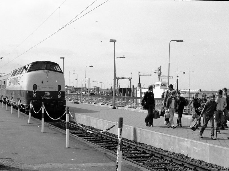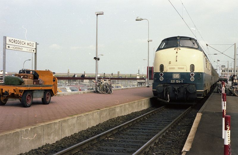 Diesel loco 221140 replaced the electric loco at Rheine and is seen here at Norddeich Mole station after arrival.