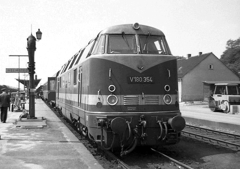 Deutsche Reichsbahn V180.354 from Magdeburg shed has taken over a Hamburg to Leipzig train at Helmstedt on 7th July 1970.