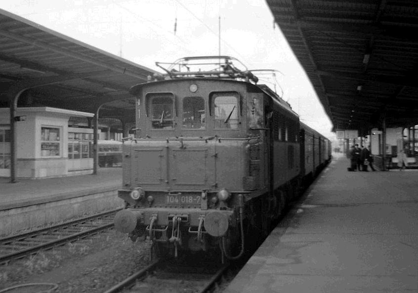 A pre-war electric locomotive 104.018 is seen at Osnabrück with a local service to Essen on 3rd July 1970.