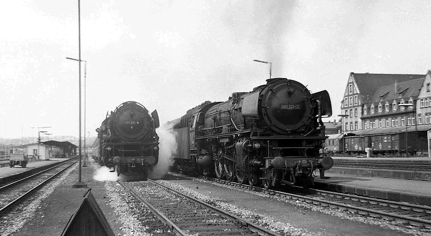 001.126 (left) has some strengthening coaches which will be added to a Görlitz to Stuttgart train which will shortly arrive from East germany. 001.131 is ready to depart with a Hof to Saarbrücken train on 23rd July 1971