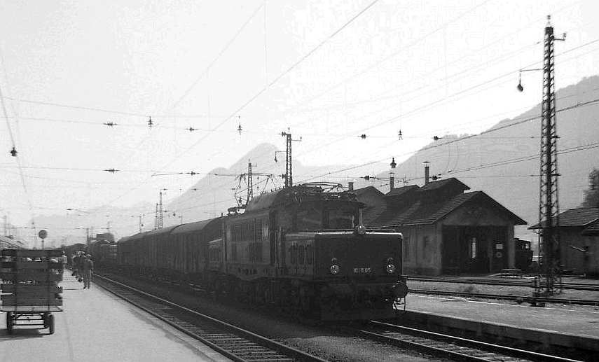 OBB 1020.05 is in the passing loop at Jenbach with a westbound freight on 27th July 1971. The shed on the right is the Zillertalbahn's.