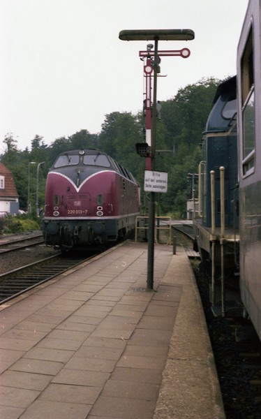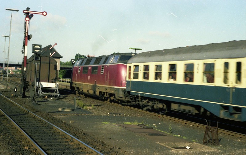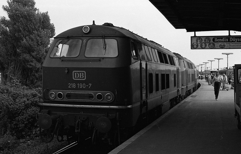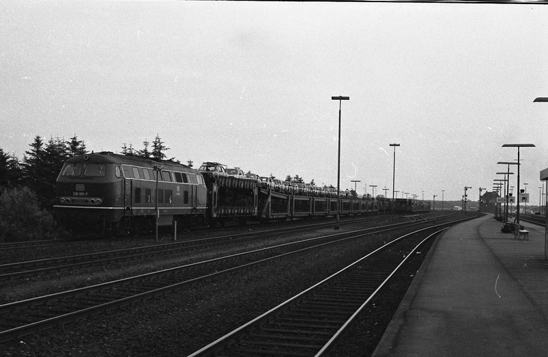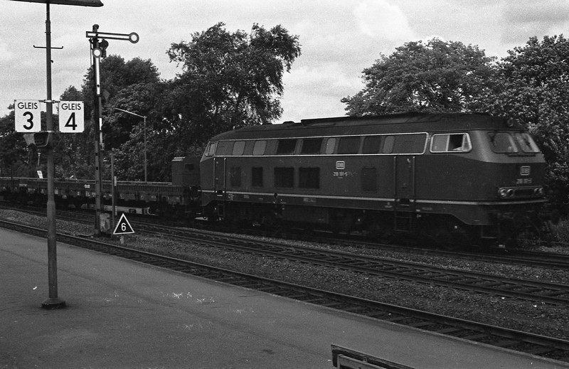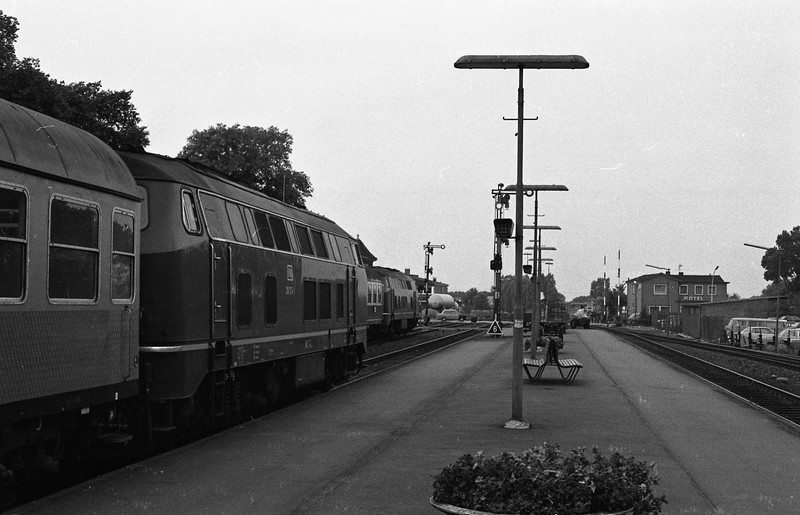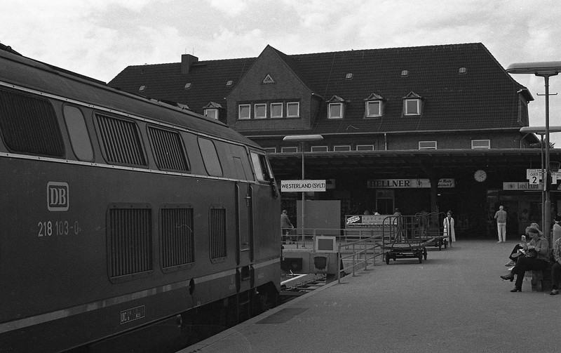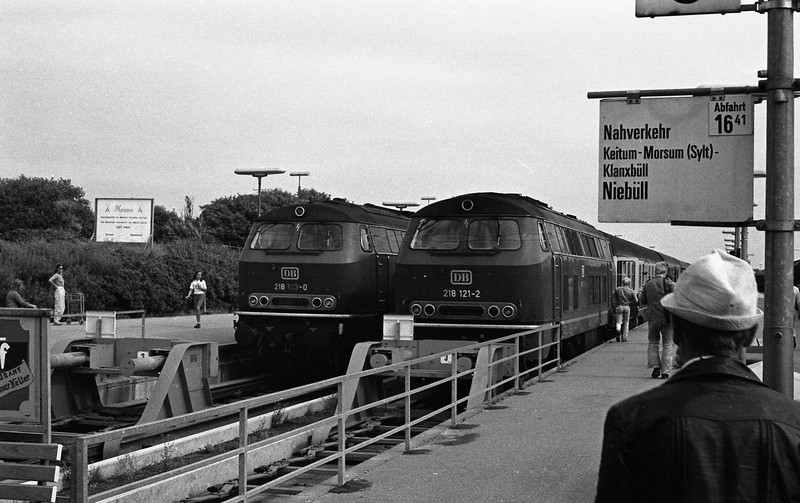 Two class 218s at the buffer stops at Westerland. My notes tell me that 218.103 which had brought me from Elmshorn was coupled to the opposite end of the train that 218.121 was coupled to. This then formed train 5759 to Niebüll with 218.121 dead on the rear.