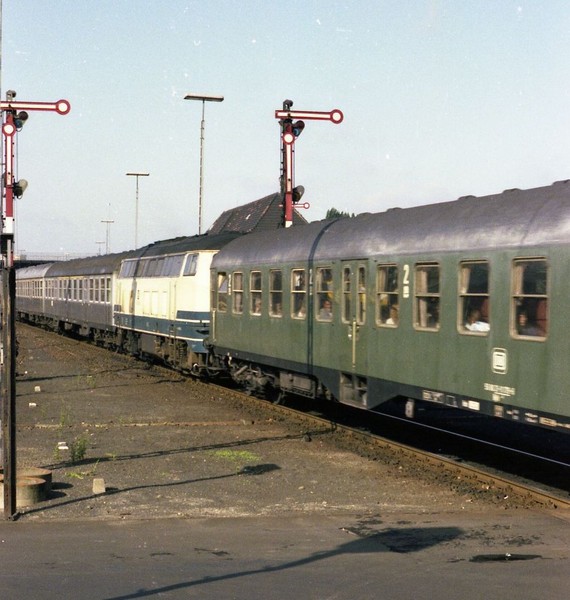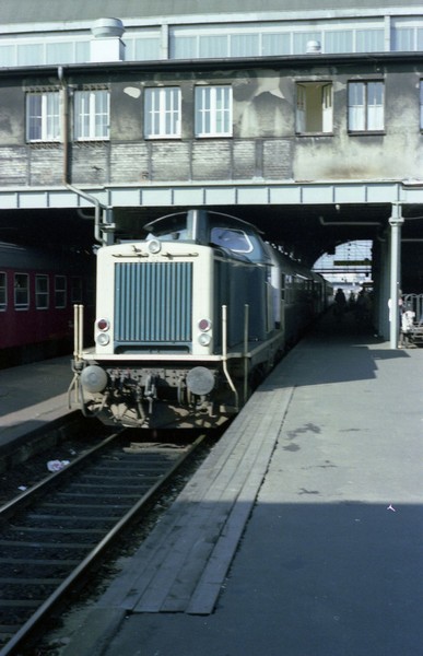 218.326 arrives at Lübeck Hbf with D280 "Alpen Express" from Rome to Kobenhaven. In the platform behind the loco are through carriages from Chur to Kobenhavn.