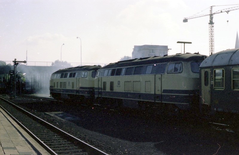 A poor view of 218.335 and 218.326 leaving Lübeck Hbf with D280 "Alpen Express" from Rome to Kobenhaven. 218.335 was added at Lübeck Hbf to work this heavy train north.