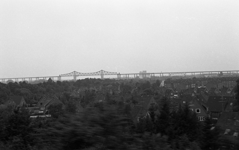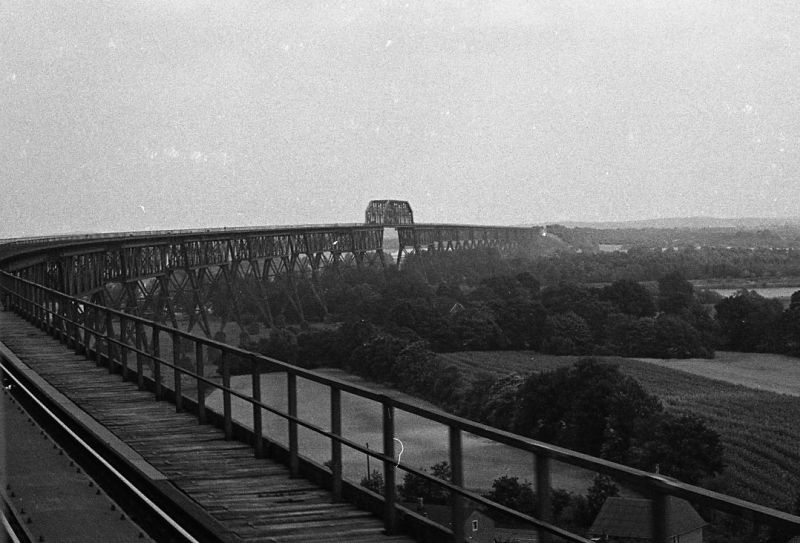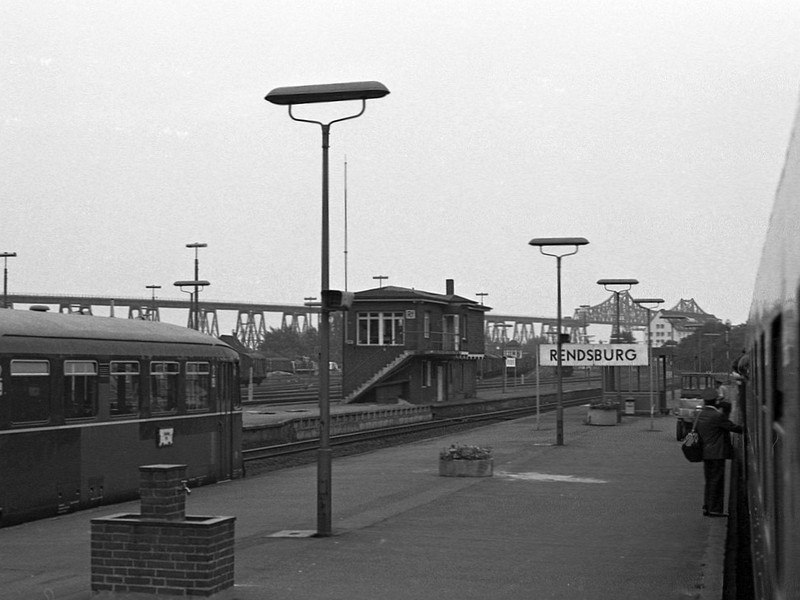 At Rendsburg the Flensburg to Hamburg line crosses the Nord-Ostsee Kanal on another high bridge which involves a spiral turn to run under the bridge before curving around to reach the high girders. Battery railcar 515.592 is on a service from Neumunster.