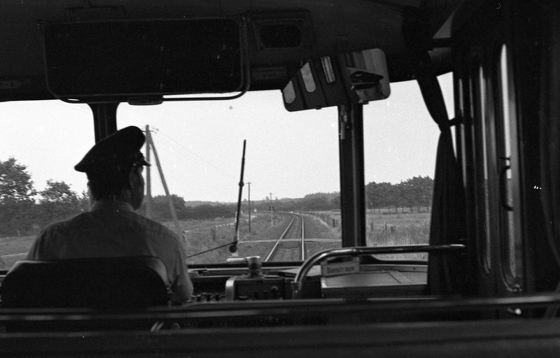 The view ahead on the soon to be closed line between Niebüll and Flensburg. Note the rather militaristic cap of the driver which DB staff still wore at this time.