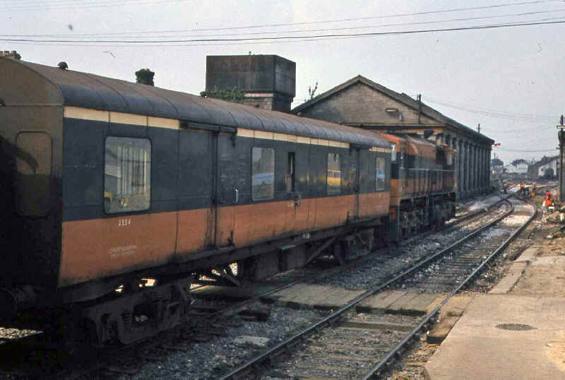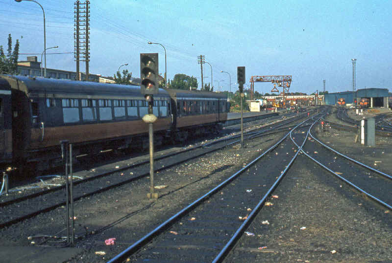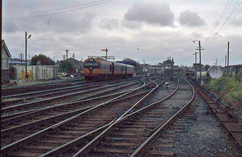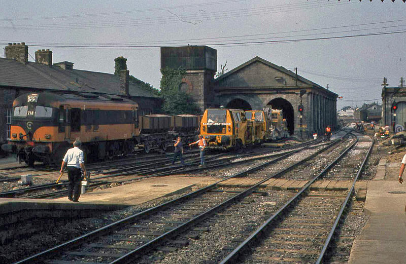 Track work and resignalling work is underway. 218 is at the head of ballast wagons at the old loco shed. In the background the rear coaches of the Westport train can be seen diverging to the right. The Galway line continues ahead.