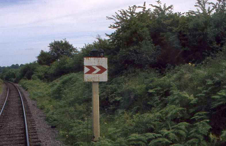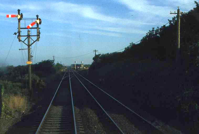 Viewed from the cab the train is about to cross over the northbound line and enter the loop at Mosney holiday camp.