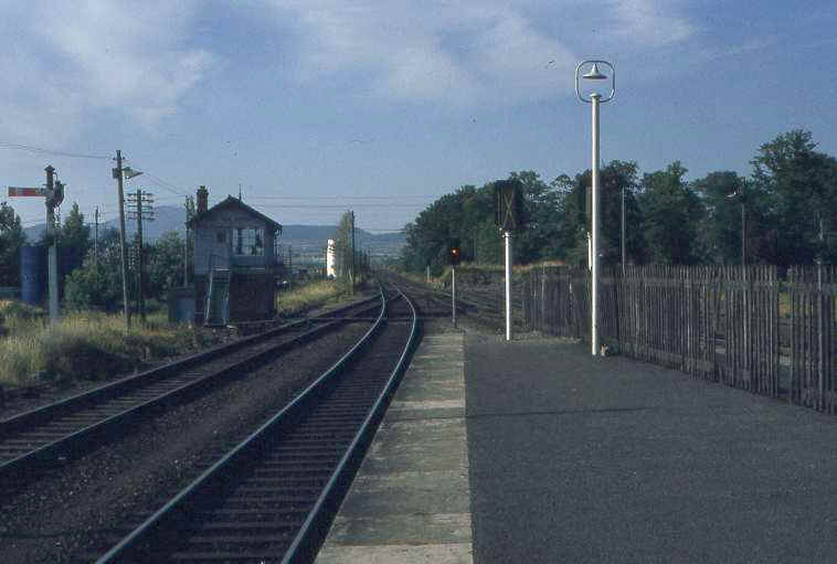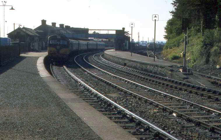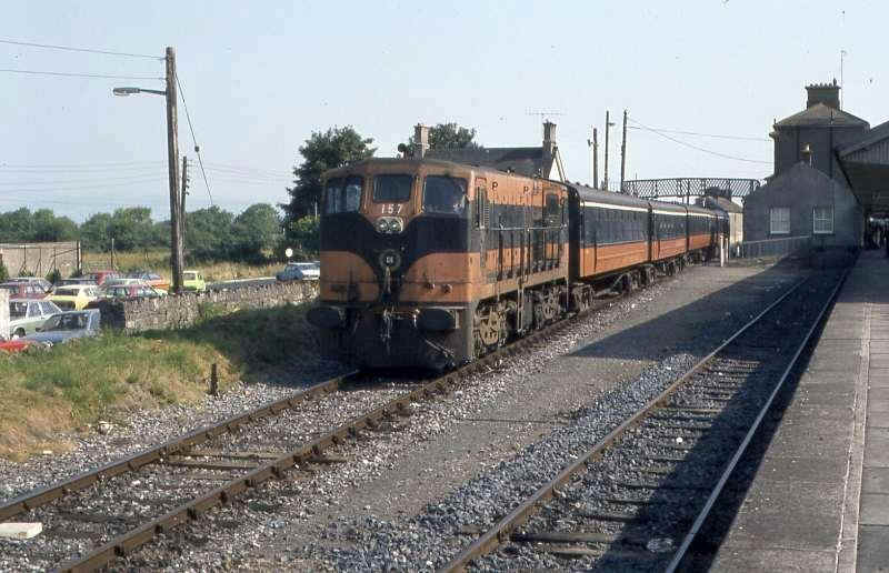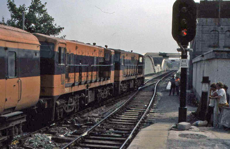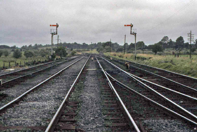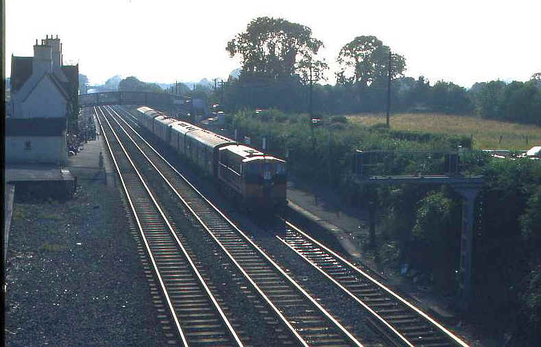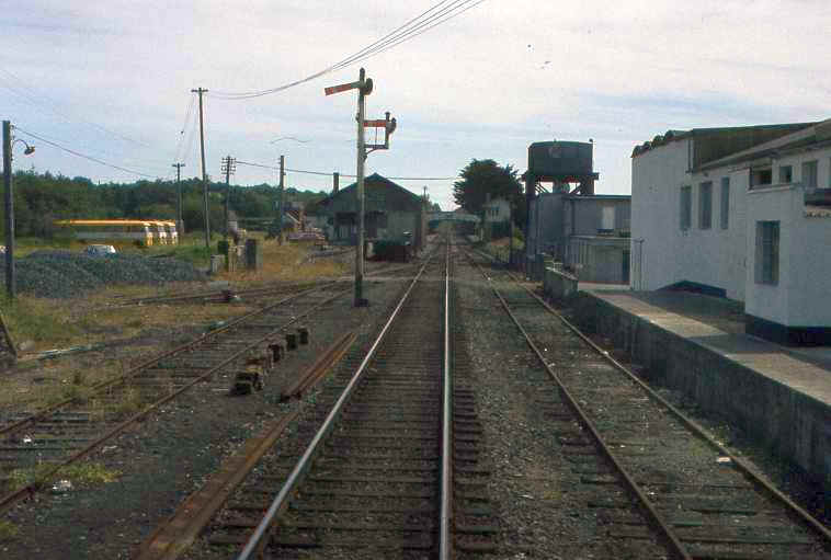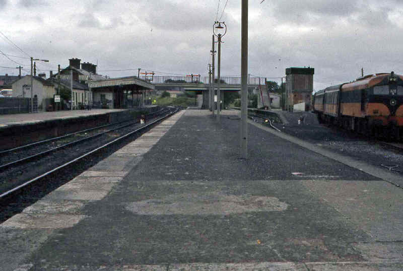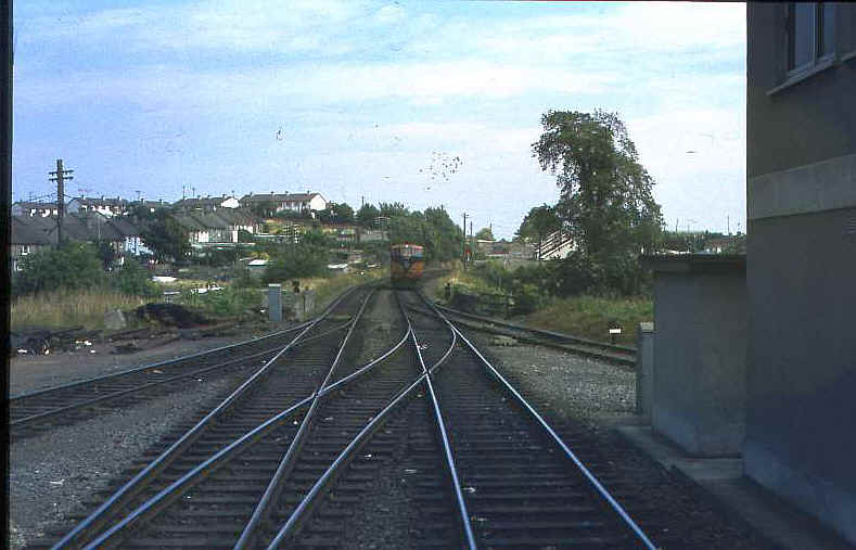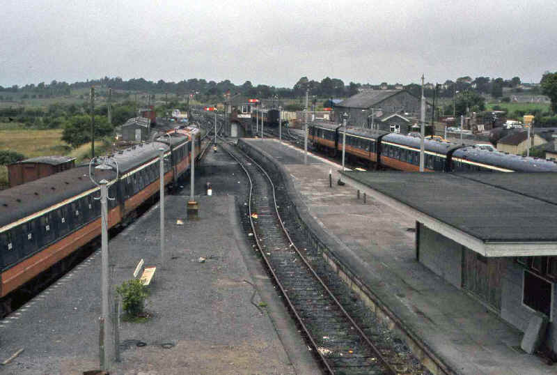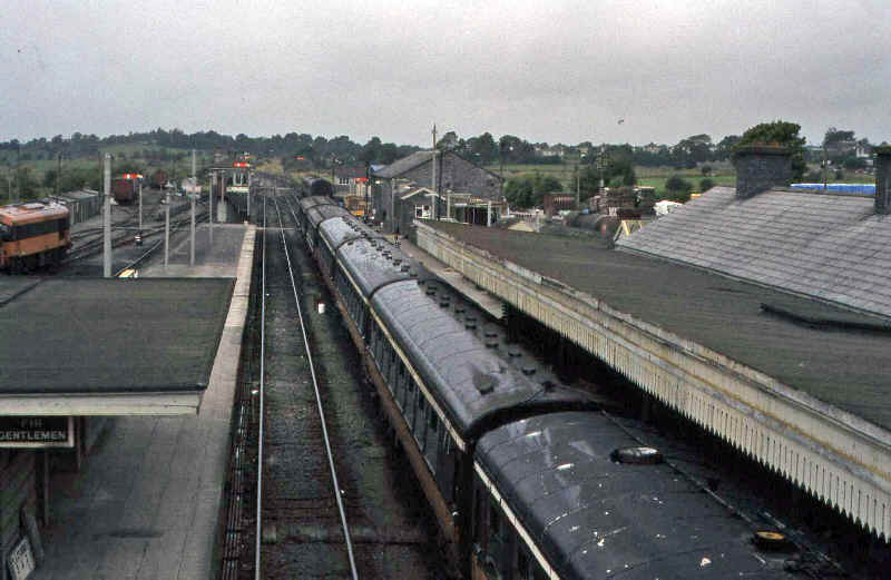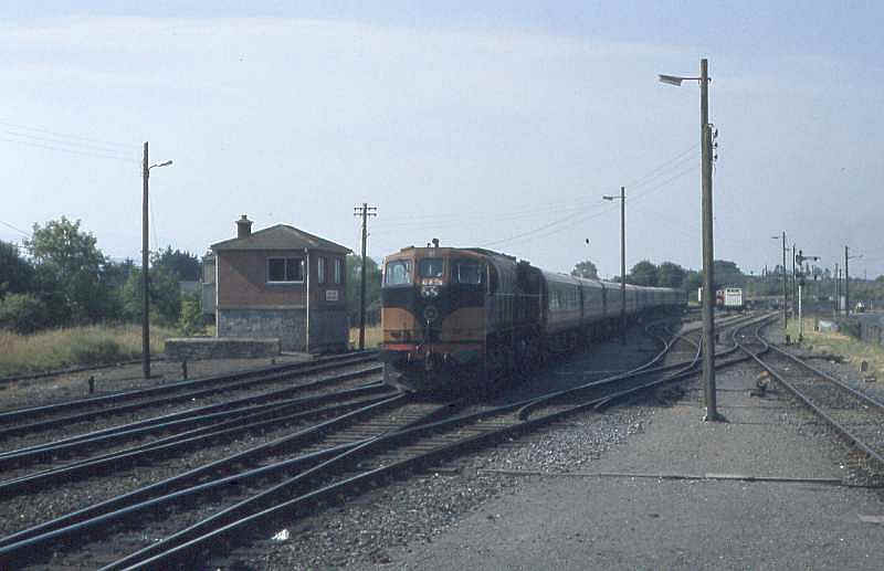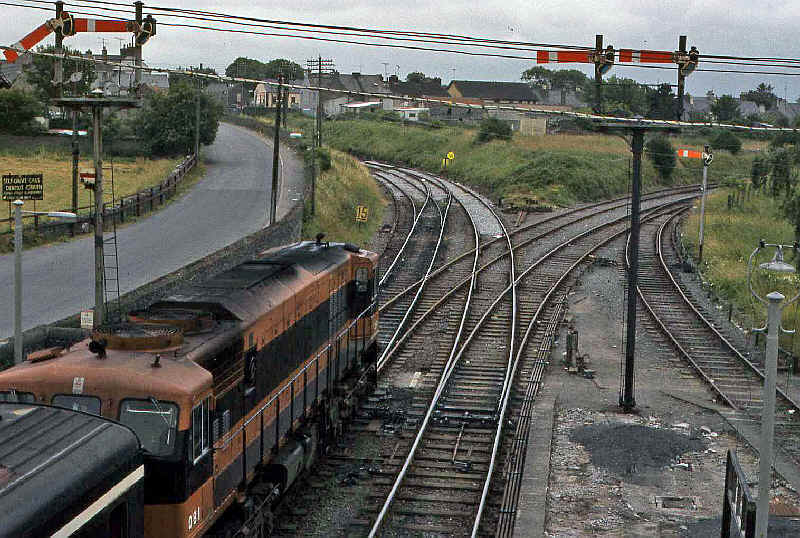 This is Portarlington with the train having crossed over onto the Up line from Cork and about to turn off onto the Athlone line at the bridge.