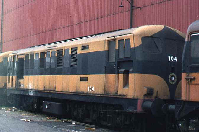 Withdrawn Sulzer diesel 104 was in a line of locos by the side of the main line