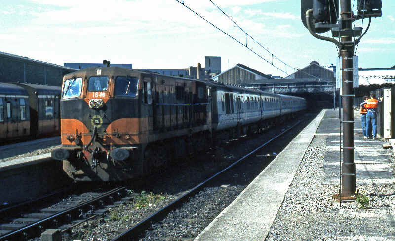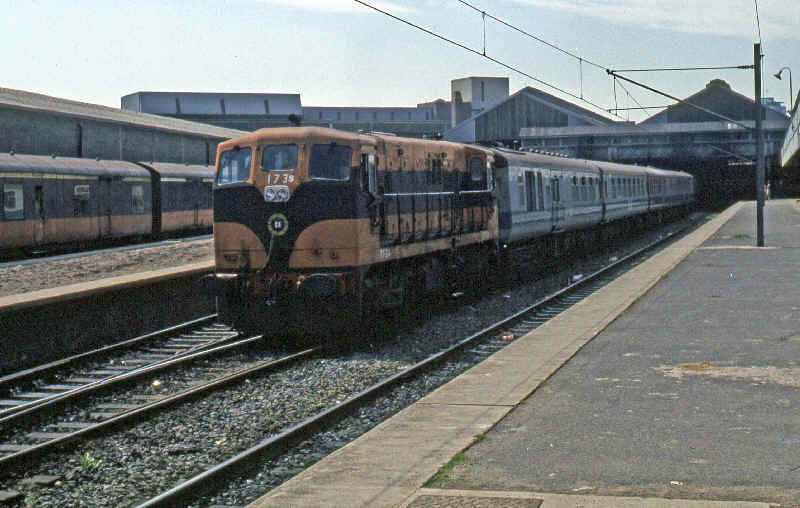 CIE 173 leaves Connolly at the head of a Belfast train made up of Mk2 coaches.