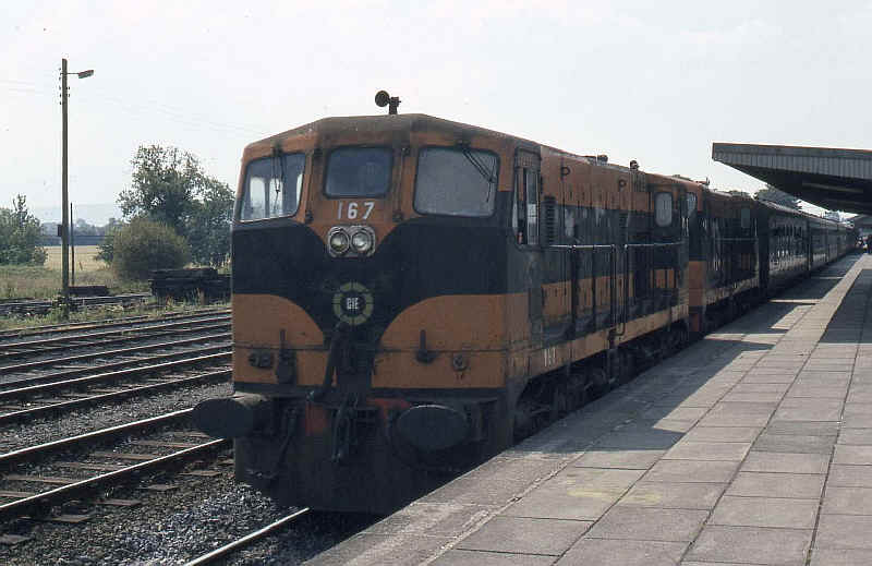 At this time Athlone was being rebuilt with a new station under construction on the east side of the Shannon bridge on the site of the old GSR station. However, the old MGWR station on the west side was still in use, The 09.25 Galway to Dublin is seen leaving behind 164 and 165.